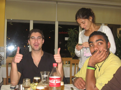 Restaurante a abarrotar, e o pessoal um pouco acanhado, foi preciso o Desporto começar com os brindes para o povo começar a entrar na onda hehe. Depois disso já nos picava-mos aos brindes com Ed. Social quais Espartanos contra um exército de Persas, o páxáxá, o Nuno que já dominava as moças de Ed de Infancia (Nuno esse que foi o autêntico REI dos brindes!! ah pois é bébé! Avé Nuno!!), a Tia Marquinhas das galinhas, o Fafe que foi o último de restaurante a ser servido e até quis por caniças no prato para caber mais paparoca, o amigos para sempre etc etc etc.